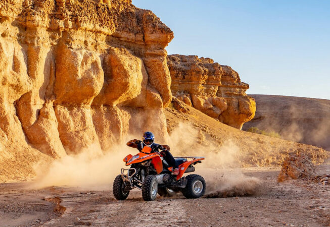 After a short rest, the real adventure begins with a two-hour quad biking excursion. Explore diverse desert landscapes, including dry riverbeds, arid hills, the Takerkoust Lake, and Berber villages. Witness a magnificent desert sunset.